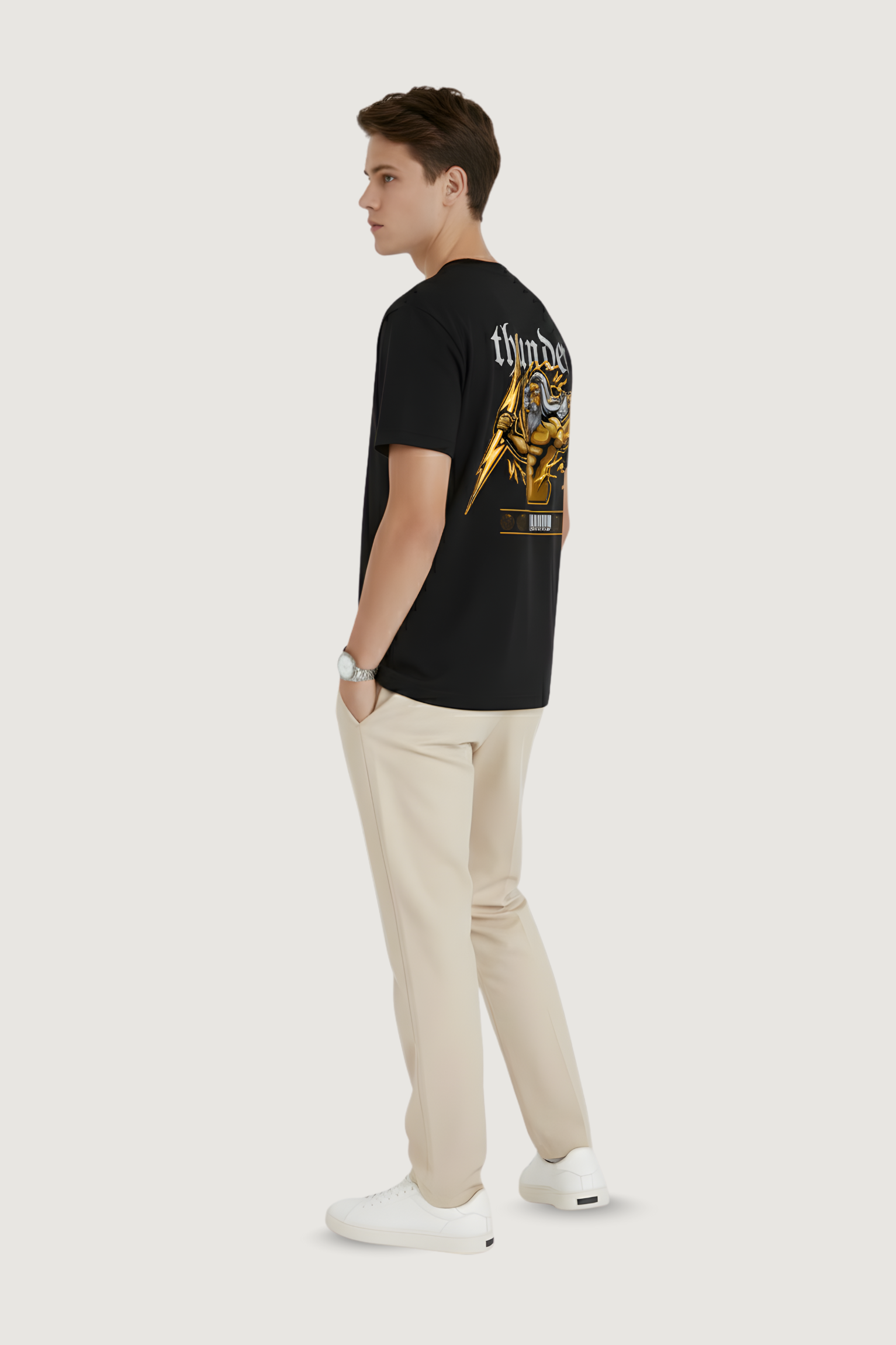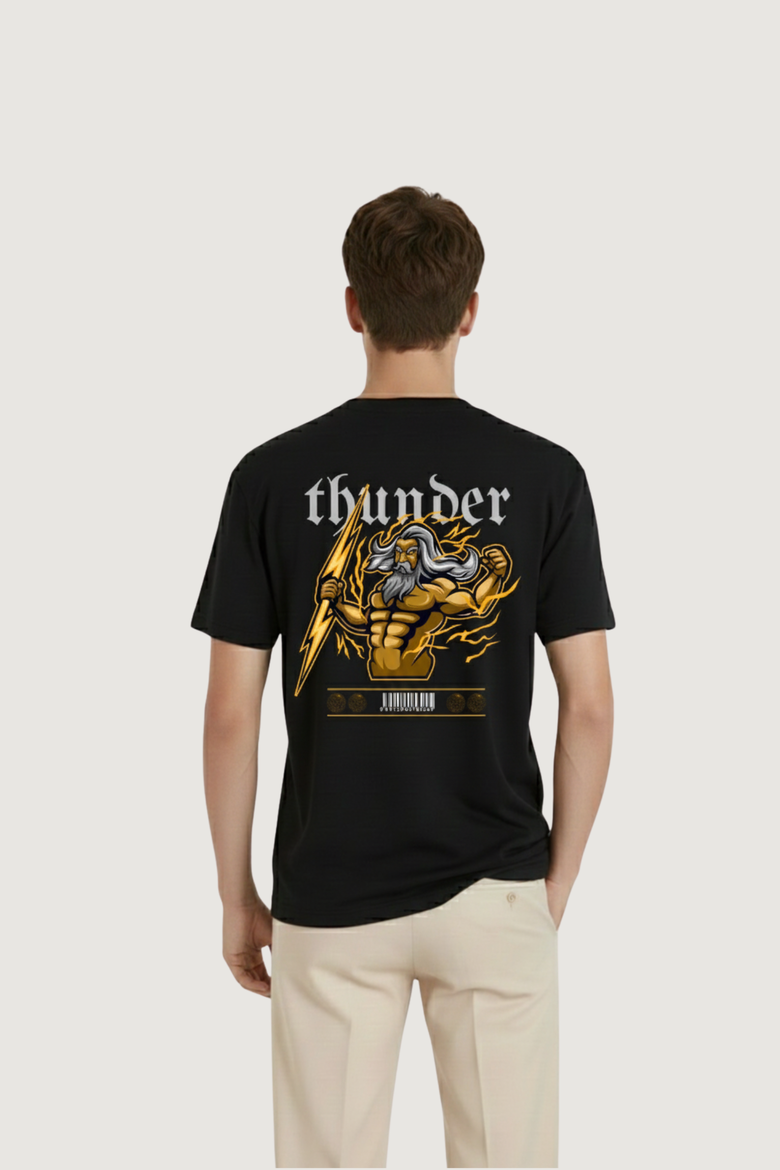 The back of the shirt features an electrifying graphic that blends mythology with a streetwear twist: